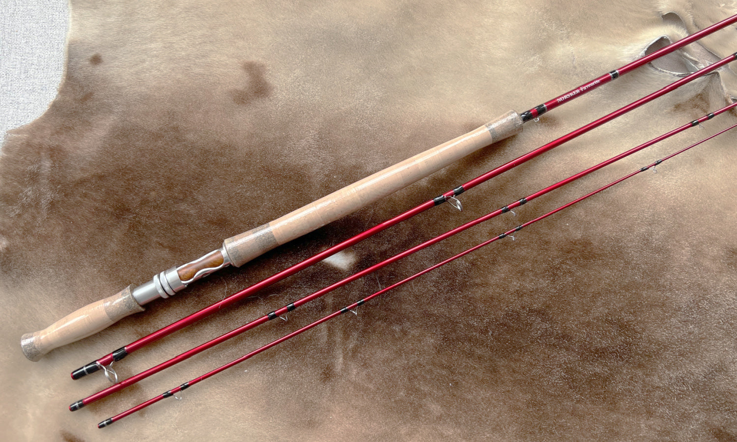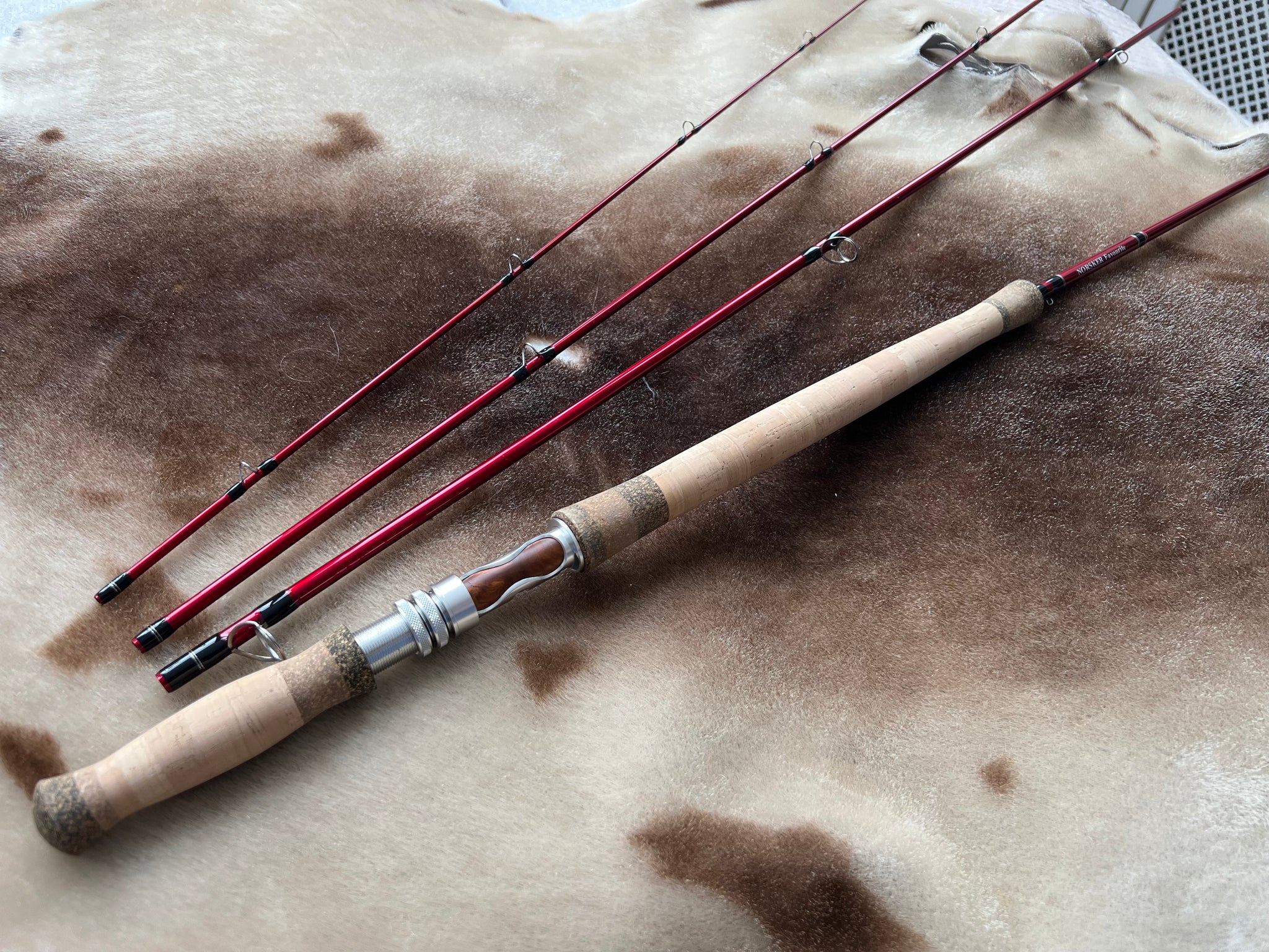 Vi benytter et smalt og elegant håndtag, som passer rigtigt godt til stangen i god kork kvalitet samt en super elegant hjulholder i alu sølv med burl træ indlæg. Stangen skal ses, den er virkelig en smuk repræsentant for NORSKER fluestænger.